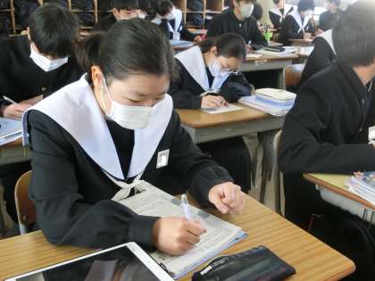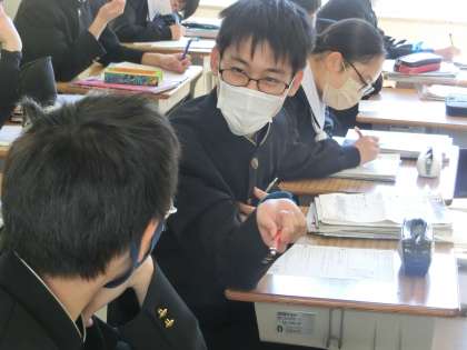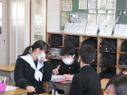 電話での誘い方・断り方を学習していました。日頃、仲間同士でもやり取りしている内容を英語に訳しながら、上手な誘い方・断り方を学んでいました。