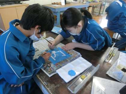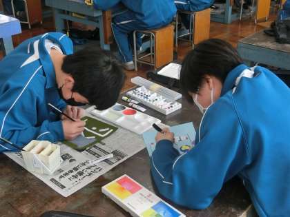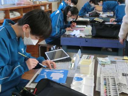 「シンボルネーム」の作品づくりです。名前の一文字を使い、自身を象徴する作品に仕上げていきます。デザインが確定し、いよいよ色付けが始まりました。タブレットで作成したイメージ画にどれだけ近づけるか。色の調整も慎重に行っていました。