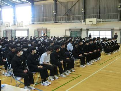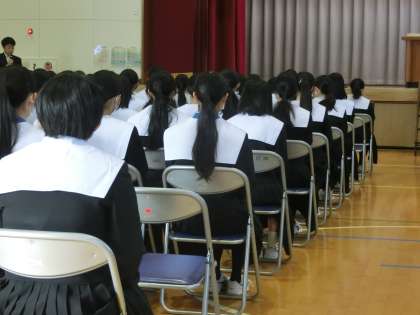 昨日までに義務教育で全ての教科の授業を終えた3年生。今日からいよいよ卒業式に向けての練習が始まりました。学年主任の話にも熱心に耳を傾け、本番を立派なものにしようという気持ちが感じられる態度で練習に取り組んでいました。