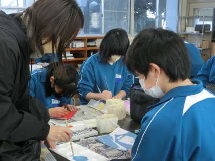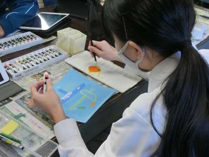 「シンボルネーム」の作品づくりです。名前の一文字を使い、自身を象徴する作品に仕上げていきます。デザインが確定し、いよいよ色付けが始まりました。タブレットで作成したイメージ画にどれだけ近づけるか。色の調整も慎重に行っていました。