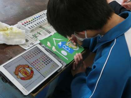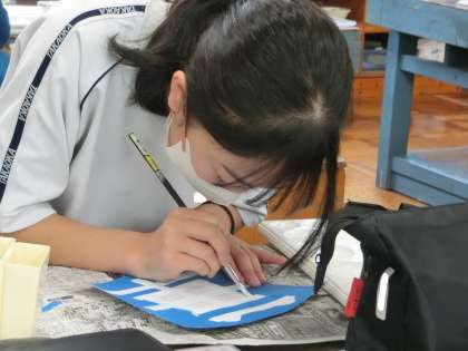 「シンボルネーム」の作品づくりです。名前の一文字を使い、自身を象徴する作品に仕上げていきます。色付けもイメージどおりに順調に進んでいるようです。