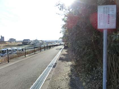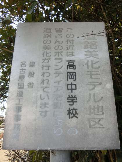 本校の東門(通称:青門)と陸橋までの間に、国道沿いの歩道があります。この歩道は、愛知万博のころに整備されたものだと聞いています。そしてその歩道の入り口には、小さな看板が設置されていました(写真中)。