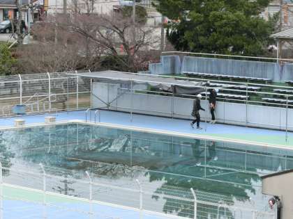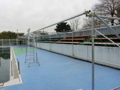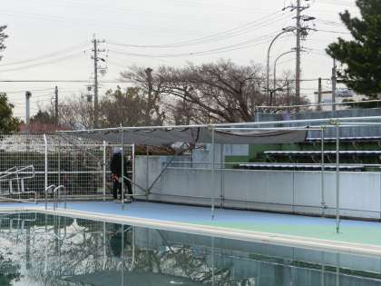 今年の夏の水泳の授業に向け、プールサイドの日よけ工事をお願いしました。3人の職人さんが手際よく作業を進めていきます。開閉できる遮光ネットを利用しての熱中症対策です。