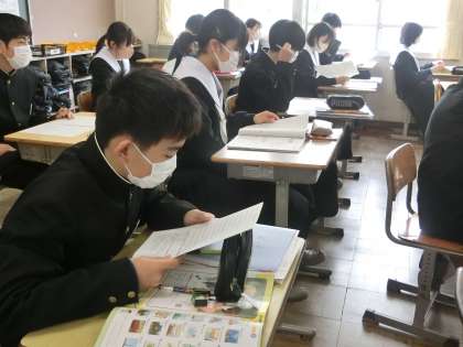 「小さなきっかけで人生が変わるお話」と題した複数の英文の話を読み解いていきます。読めない単語や意味の分からない単語も多く含まれていますが、タイトルに魅力を感じ、生徒たちは必死に読み込んでいました。