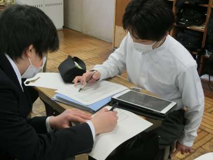 「データの活用」の単元の学習に入り、今回はまずデータ収集です。紙が床に落ちるまでの時間を計測していきます。仲間と協力し、何度も記録を取っている姿に感心しました。