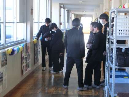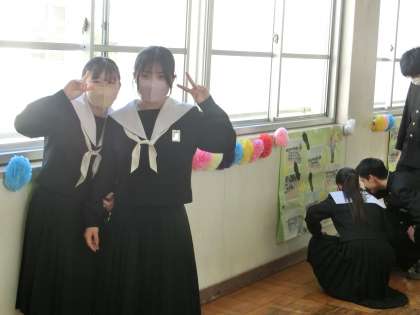 3年生の学年フロア・昇降口などには、1,2年生によって手作りされた飾りつけと思い出の写真の数々が掲示されていました。朝のさわやかな空気の中、3年生たちは掲示された写真を眺め、思い出に浸っていました。