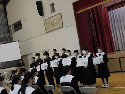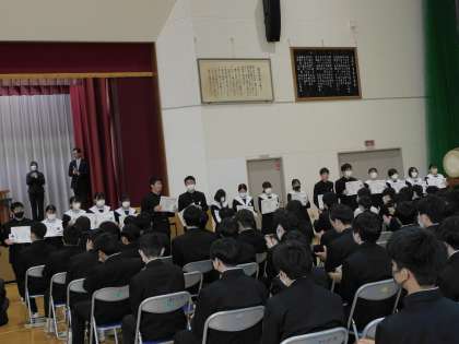 「高中賞」とは、日頃の行いがよく、他の模範となる生徒を表彰するもので、生徒同士が互いにがんばりを称賛する「高岡賞」を数多く受賞したり、教職員などからの推薦によって受賞生徒が決定されます。今回は3年生のみの表彰でしたが、30名が表彰されました。