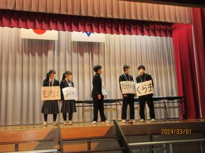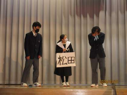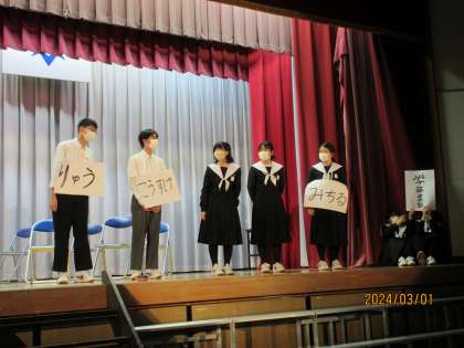 各クラスや3年生の先生たちのエピソード劇(後半の部)の様子です。