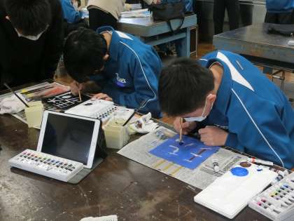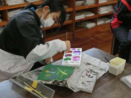 「シンボルネーム」の作品づくりです。名前の一文字を使い、自身を象徴する作品に仕上げていきます。色付けもイメージどおり、順調に進んでいるようです。