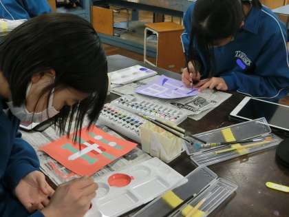 「シンボルネーム」の作品づくりです。名前の一文字を使い、自身を象徴する作品に仕上げていきます。色付けもイメージどおり、順調に進んでいるようです。
