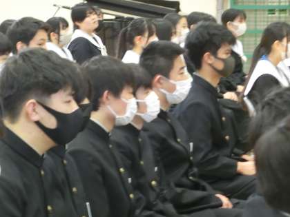 式の中で話をされる方の代役を3年部の先生たちが務め、3年生にコメントを述べていきます。思い出話や将来に向けての話など、内容もバラエティに富んでいました。