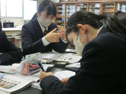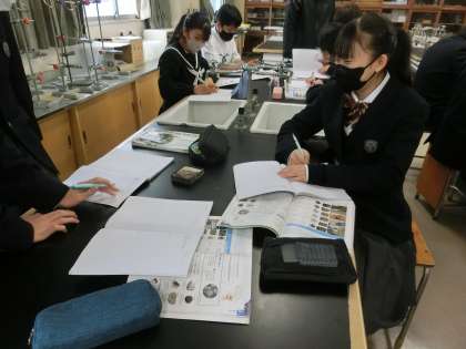 3/5 1-2 堆積岩の特徴 2 公開日 2024/03/05 更新日 2024/03/05 各学年から 1年2組の理科の授業の様子です。 堆積岩の特徴を学習していました。本物の堆積岩を手にし、一つ一つ特徴をノートに書き込んでいます。中には日頃目にしている石とどこが違うのか考えている生徒もいました。