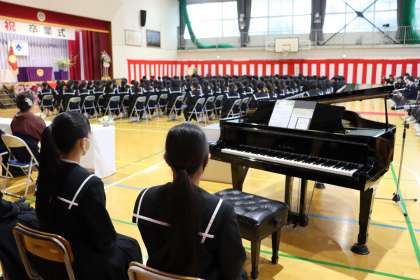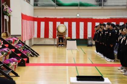 卒業生が入場後、来賓紹介並びに祝電・記念品披露が行われ、「高中太鼓 三願」でいよいよ会式です。
