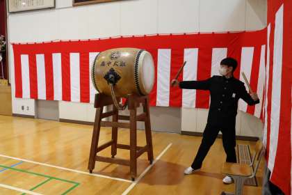 卒業生が入場後、来賓紹介並びに祝電・記念品披露が行われ、「高中太鼓 三願」でいよいよ会式です。