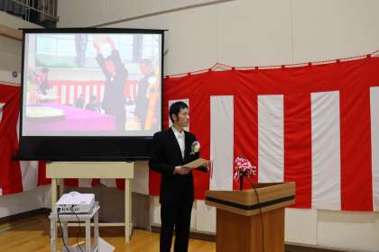卒業証書授与です。担任の呼称に、卒業生が元気に返事をしていきます。担任の後ろには、証書授与の様子が映像で流されています。