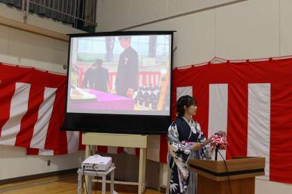 卒業証書授与です。担任の呼称に、卒業生が元気に返事をしていきます。担任の後ろには、証書授与の様子が映像で流されています。