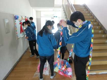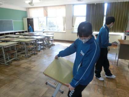 立派に巣立って行った3年生の姿に近づこうと、2年生が卒業式の式場や3年生の各教室・学年フロアなどの片づけを行ってくれています。