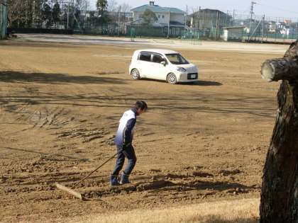 体育の授業は運動場でのサッカーの授業。でも、昨日の卒業式の駐車場であった運動場は大変なことに…。