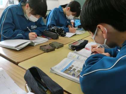 堆積岩の特徴を学習していました。本物の堆積岩を手にし、一つ一つ特徴をノートに書き込んでいます。中には日頃目にしている石とどこが違うのか考えている生徒もいました。