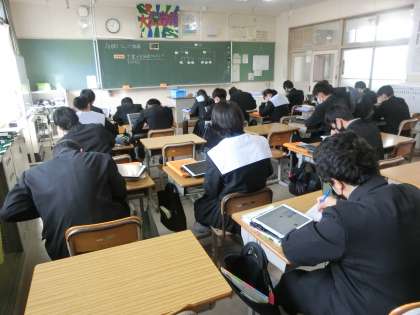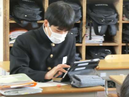 ジャンプ課題の「一年間で学習した内容の中からさらに深掘り」について学習が進められていました。興味をもった内容を中心に深掘りしていきます。中には、仲間に分かりやすく学習内容を伝えようとテーマを決めている生徒もいました。