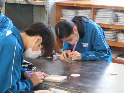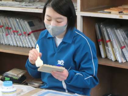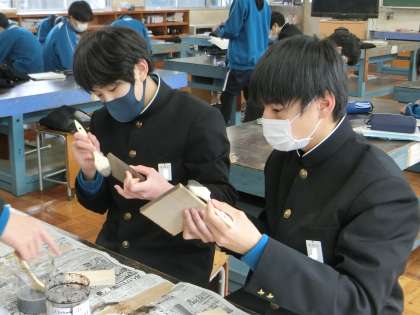 木彫の学習・木製コースターづくりもいよいよ大詰めです。一生懸命彫り上げた作品にニスを塗っていきます。納得いくまで何度も塗り直している生徒もいました。