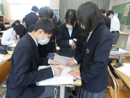 前回の授業でとったデータをヒストグラム(柱状グラフ)にまとめていきます。最大値・最小値・平均など、様々な視点から考察していました。