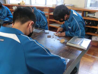 木彫の学習で木製コースターづくりに取り組んでいます。出来上がりをイメージしながら、安全に活動を進めていました。