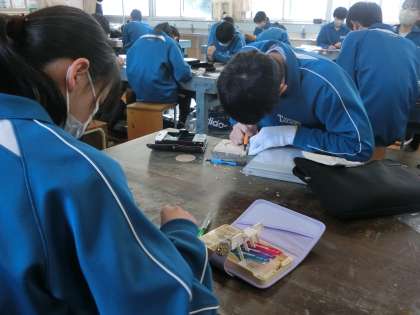 3/8 2-2 イメージどおりの完成をめざして… 2 公開日 2024/03/08 更新日 2024/03/08 各学年から 2年2組の美術の授業の様子です。 木彫の学習で木製コースターづくりに取り組んでいます。出来上がりをイメージしながら、安全に活動を進めていました。