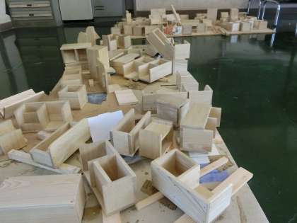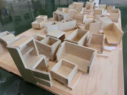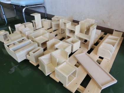 1年生の各クラスの生徒の作品にニスが塗られ、木工室の隣の部屋に並べられています。