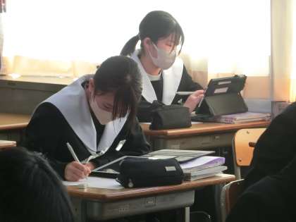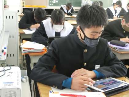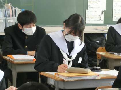 ジャンプ課題の「一年間で学習した内容の中からさらに深掘り」について学習が進められていました。興味をもった内容を中心に深掘りしていきます。テーマも確定し、下書きを完成させた生徒も出始め、いよいよレポートとしての清書に取りかかっていました。