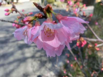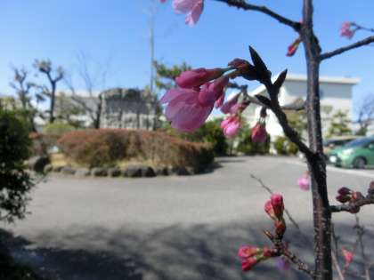 校内の桜の木には、蕾の濃いピンクと咲いた花の淡いピンクが目に付くようになりました。