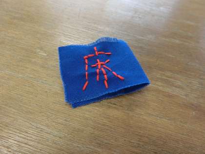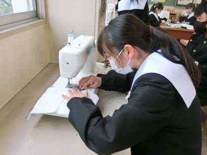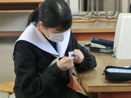来年度の新しい学級で使用するぞうきんを作っていました。「床」という文字をラベルに縫い、ミシンを使ってぞうきんに取り付けていきます。来年度の清掃活動が充実するよう、大切に使用してもらいたいと思います。
