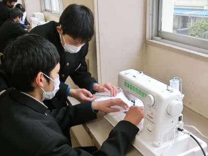 来年度の新しい学級で使用するぞうきんを作っていました。「床」という文字をラベルに縫い、ミシンを使ってぞうきんに取り付けていきます。来年度の清掃活動が充実するよう、大切に使用してもらいたいと思います。