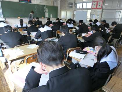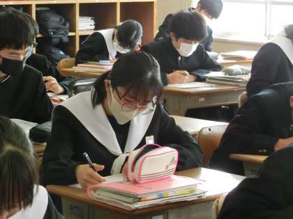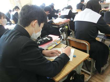 年度が明けるとすぐに取り組む「中学生の主張作文」。今回はこれまでに考えてきた文章構成をもとに、いよいよ作文書きに入っていました。自分の主張したいことがぼやけてしまわないよう意識して書き進めていました。