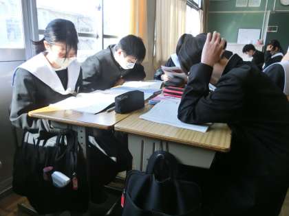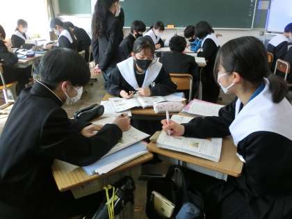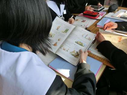 ALTのアドバイスをもらいながら、「英文の名作を班で協力して読もう!」をテーマに学習が進められていました。英文の読解に苦労しながらも、楽しみながら学習している様子が印象的でした。