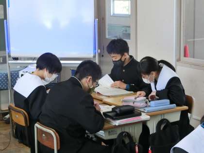 ALTのアドバイスをもらいながら、「英文の名作を班で協力して読もう!」をテーマに学習が進められていました。英文の読解に苦労しながらも、楽しみながら学習している様子が印象的でした。
