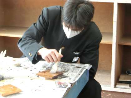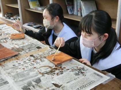 木彫の学習・木製コースターづくりもいよいよ大詰めです。必死に彫りの活動に取り組んでいる生徒がいます。また、一生懸命彫り上げた作品にニスを塗っている生徒もいます。納得のいく作品に仕上がること願っています。