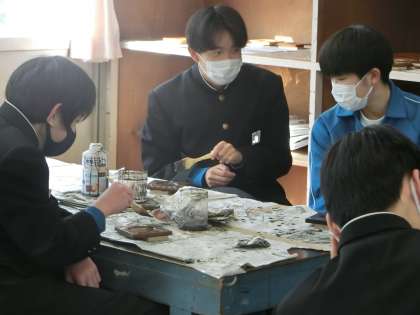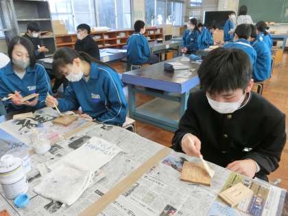 木彫の学習・木製コースターづくりもいよいよ大詰めです。必死に彫りの活動に取り組んでいる生徒がいます。また、一生懸命彫り上げた作品にニスを塗っている生徒もいます。納得のいく作品に仕上がること願っています。