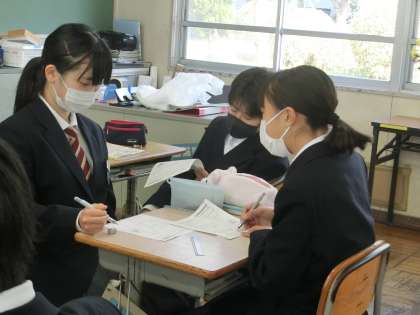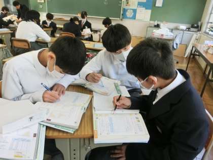 一年間の総復習を仲間と取り組んでいました。単元の復習プリントやテキストなどを使い、来年度早々のテストを見据えてしっかり復習していました。