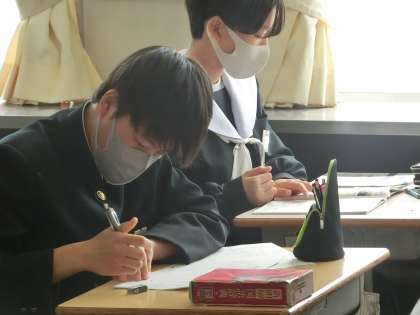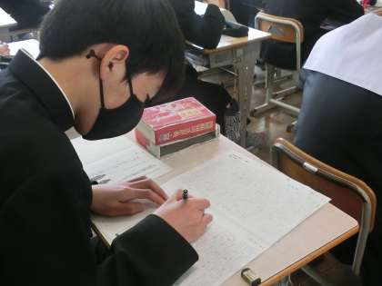 年度が明けるとすぐに取り組む「中学生の主張作文」。今回はこれまでに考えてきた文章構成をもとに、いよいよ作文書きに入っていました。自分の主張したいことがぼやけてしまわないよう意識して書き進めていました。