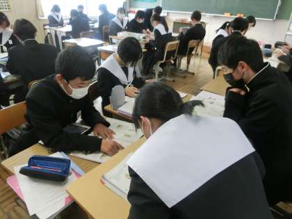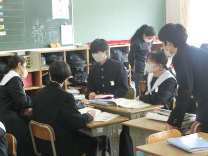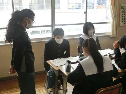 ALTのアドバイスをもらいながら、「英文の名作を班で協力して読もう!」をテーマに学習が進められていました。英文の読解に苦労しながらも、範囲を分担したり、得意な部分で力を発揮しながら学習している様子が印象的でした。