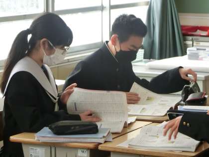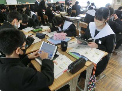 ALTのアドバイスをもらいながら、「英文の名作を班で協力して読もう!」をテーマに学習が進められていました。英文の読解に苦労しながらも、範囲を分担したり、得意な部分で力を発揮しながら学習している様子が印象的でした。