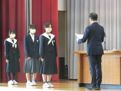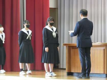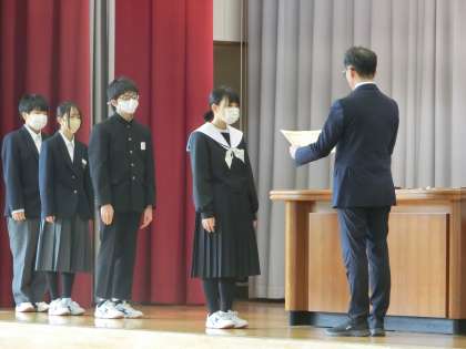 修了式に先立って、令和6年度前期生徒会役員の認証と表彰伝達が行われました。
