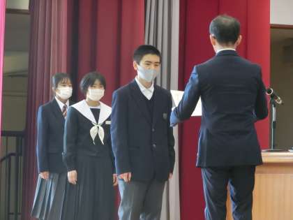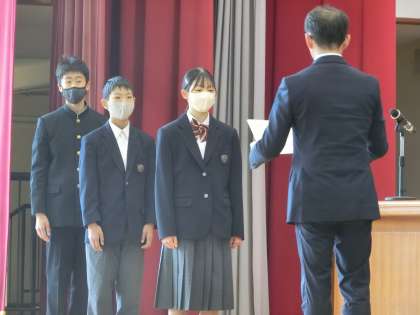 修了式に先立って、令和6年度前期生徒会役員の認証と表彰伝達が行われました。