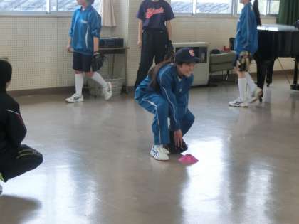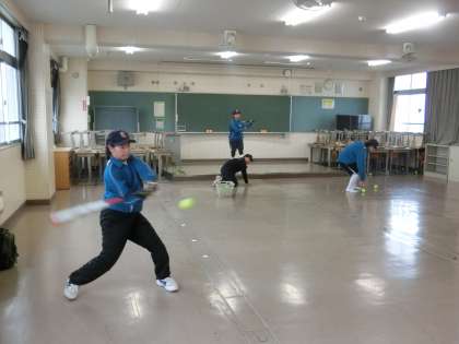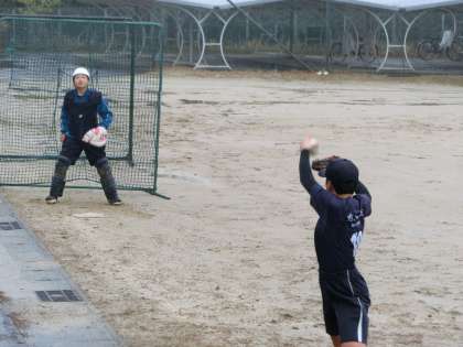 小雨の降る中、バッテリーは屋外でピッチング練習、野手は屋内で打撃練習と守備の基礎メニューに取り組んでいました。