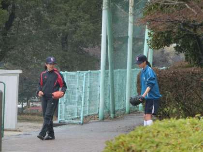 小雨の降る中、バッテリーは屋外でピッチング練習、野手は屋内で打撃練習と守備の基礎メニューに取り組んでいました。