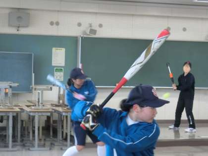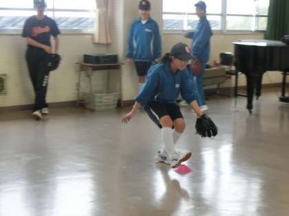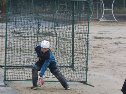 小雨の降る中、バッテリーは屋外でピッチング練習、野手は屋内で打撃練習と守備の基礎メニューに取り組んでいました。