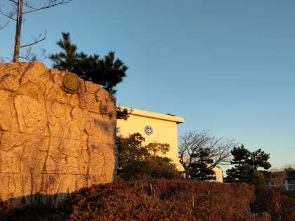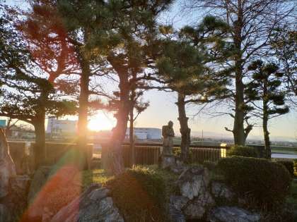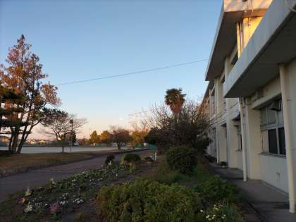 日の出とともに校舎はオレンジ色に浮かび上がり、周りの木々の陰がくっきり映っています。そして西の空にはまだ月が見えます。(写真下・中央部分)