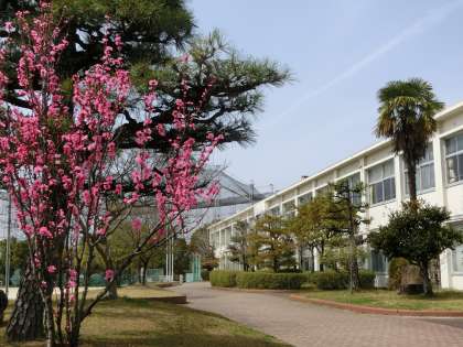 東門(通称:青門)から入ってすぐにある桃の木。濃いピンクの花を付け、校内では花壇に並び、見栄えする場所になっています。