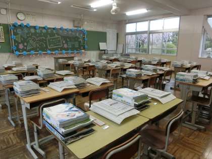 写真は、生徒を待つ1年生の教室の様子です。